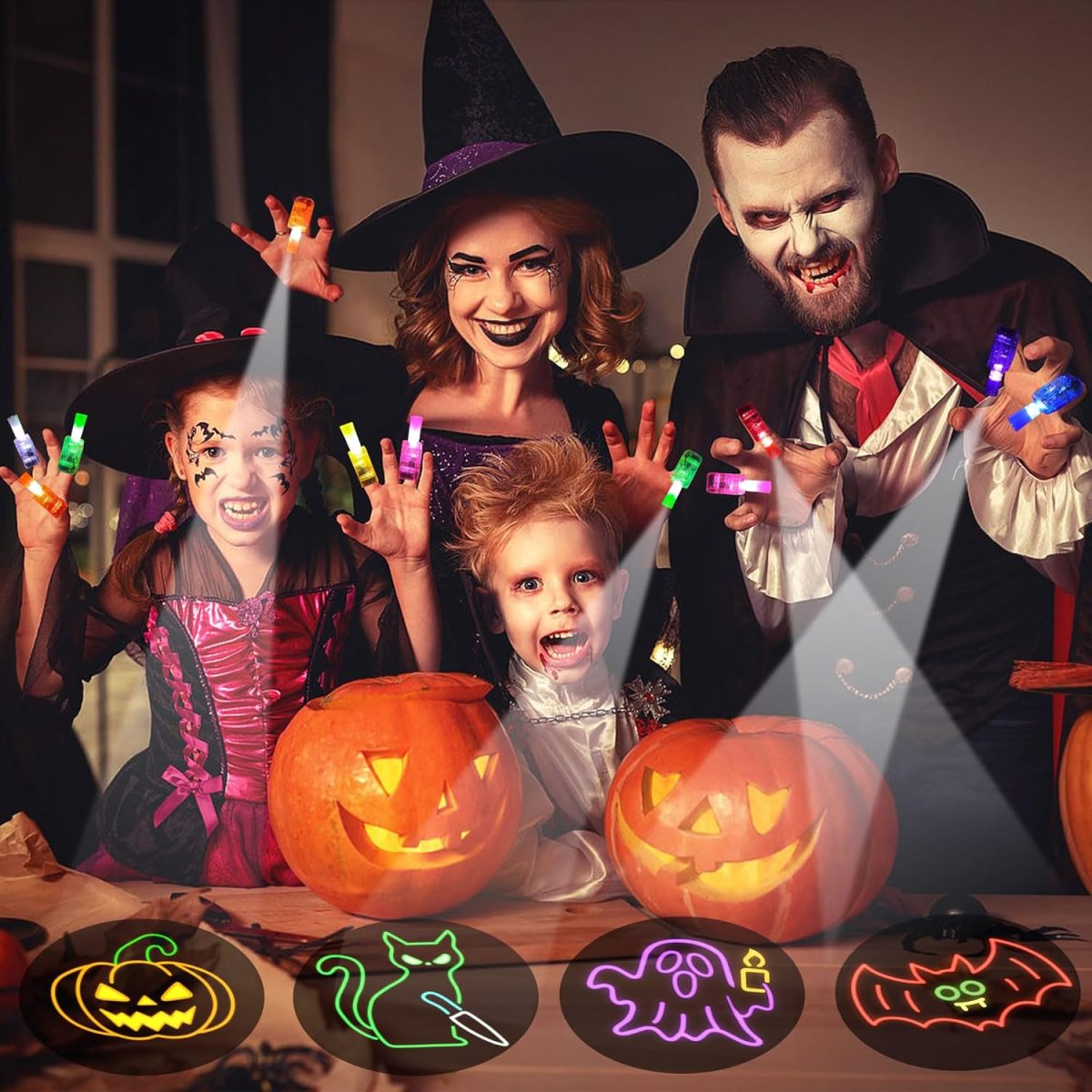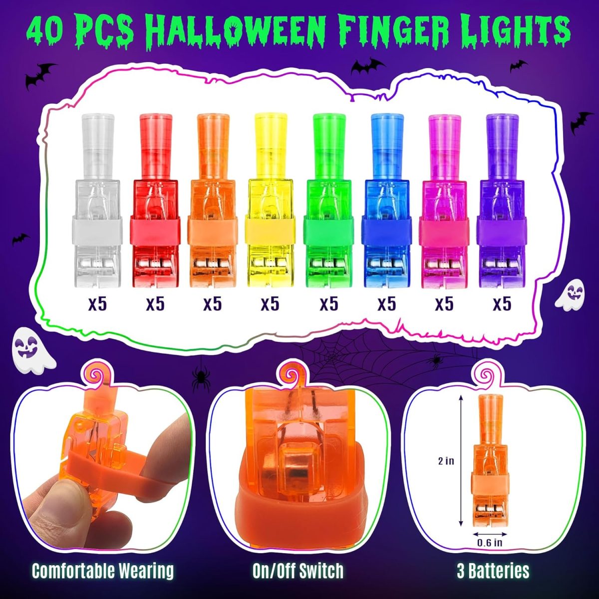 - Halloween Pack:40 finger light toys in 8 different styles are included in this Halloween pack. Pressing the switch causes the lights to display Halloween patterns. The glowing patterns add to the fun of Halloween by appearing bright and clear in the dark.