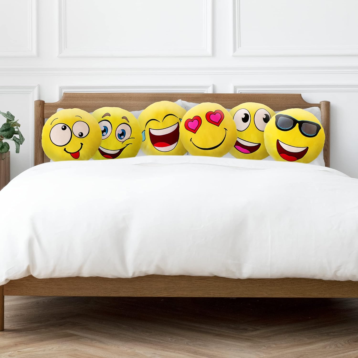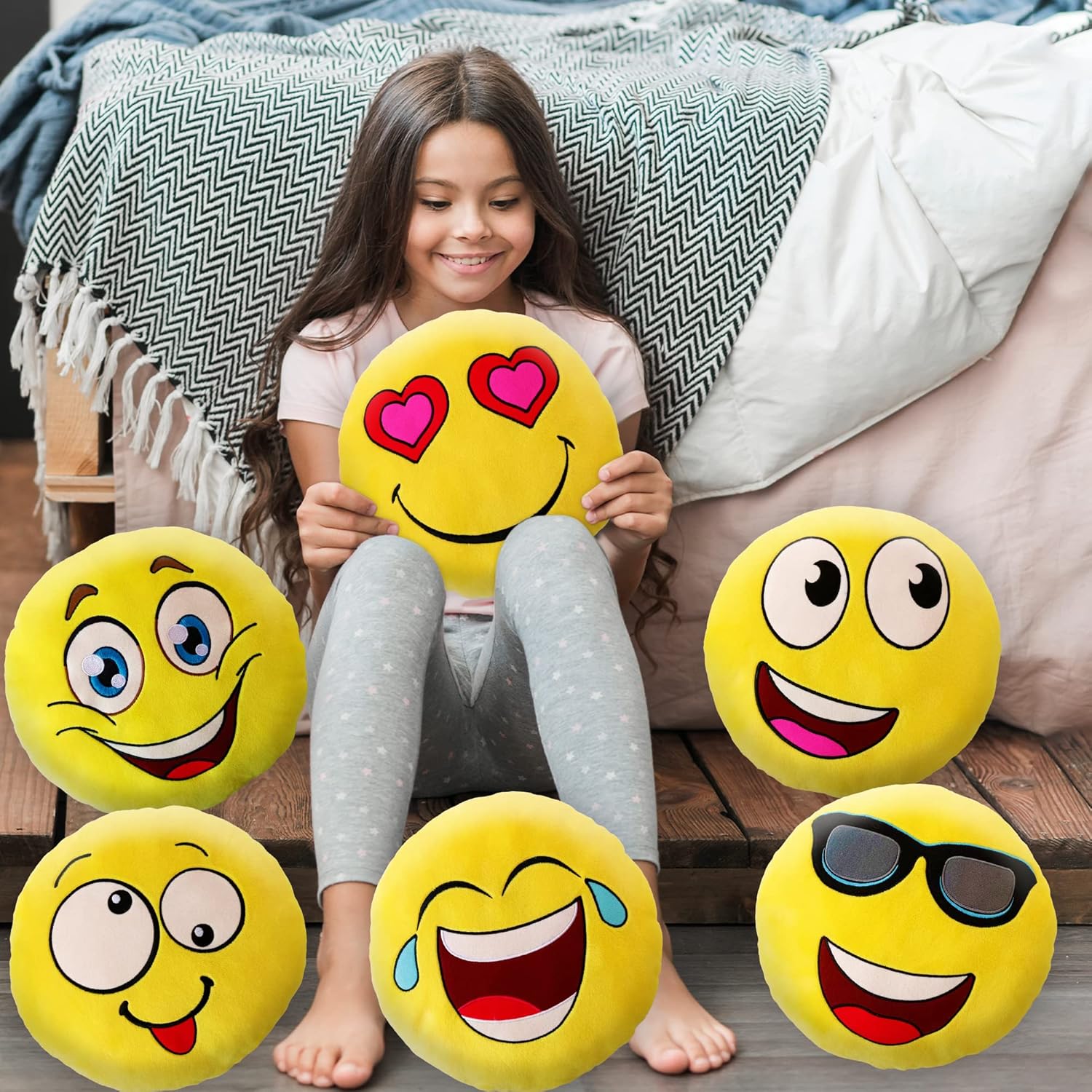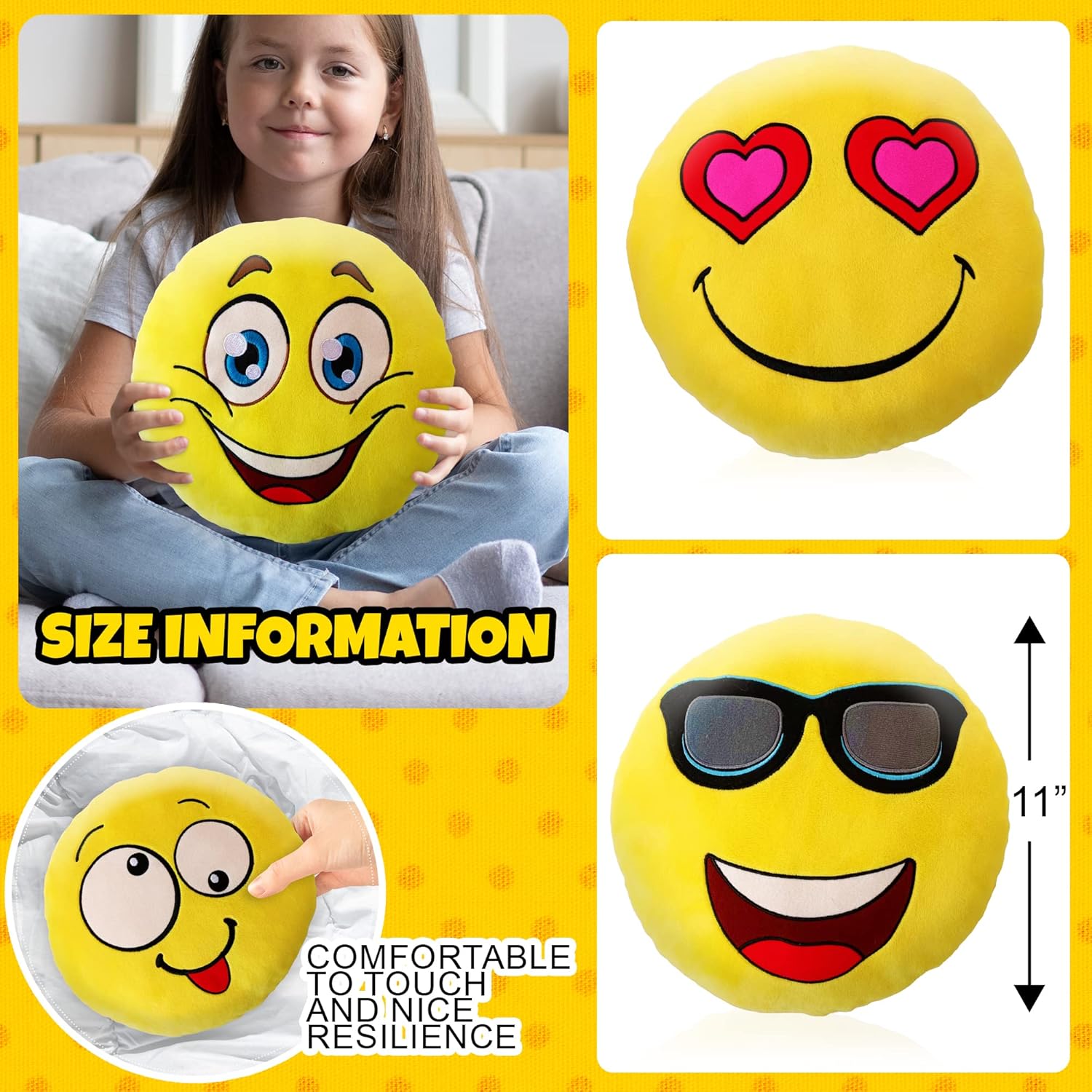 Bring smiles to any space with this set of 6 emoji pillows, 11”in vibrant yellow. Providing fun faces like kiss, wink, laugh, sunglasses, cheeky, and heart eyes. These soft smiley face cushions are ideal for cuddles, décor, or gifting. With long lasting stitching and extremely smooth filling, each smiley pillow is relaxed, playful,cozy and built to last.