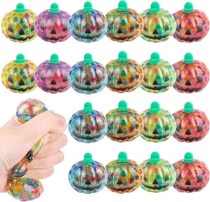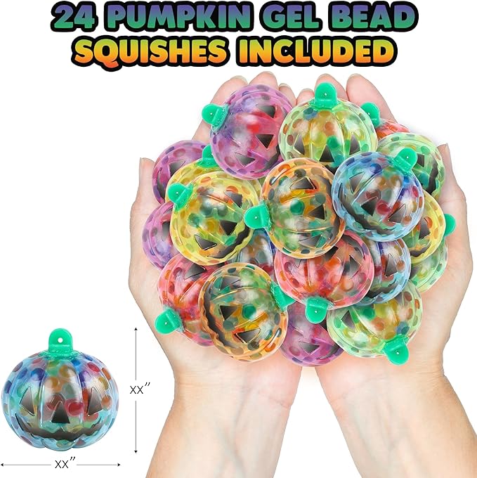 The set includes 24 pumpkin squeeze toys in 6 colors. The toys are soft and safe for kids to play with. They make good Halloween kids toys that children can squeeze for fun or stress relief. These can be used as Halloween party toys for trick-or-treat handouts, classroom prizes or party favors. They also work as simple Halloween kids gifts instead of candy. The pumpkin shape and bright colors make them fun for kids to keep and play with.