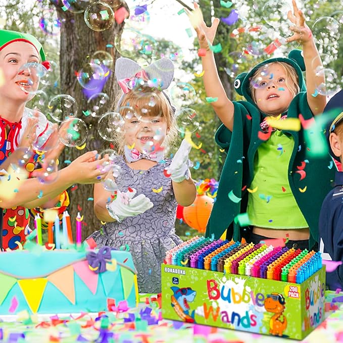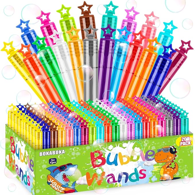 This set has 200 mini bubble wands in 20 neon colors. The wands are small and easy for kids to hold. They make a fun pick for Halloween kids toys, party favors and everyday play.You can use them as Halloween party toys, classroom prizes, or goodie bag fillers. They are also nice Halloween kids gifts for trick-or-treat night or school events. Kids will enjoy blowing bubbles together and having fun indoors or outdoors.A big pack that gives you enough for parties, holidays or any special event.