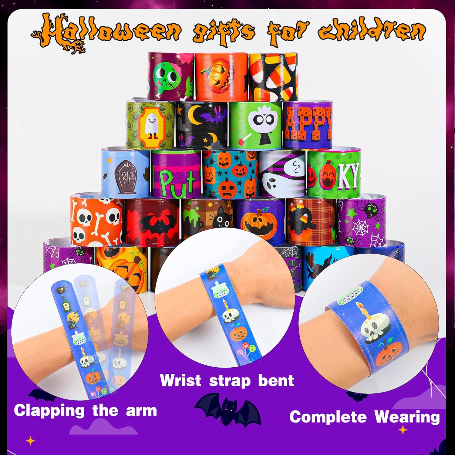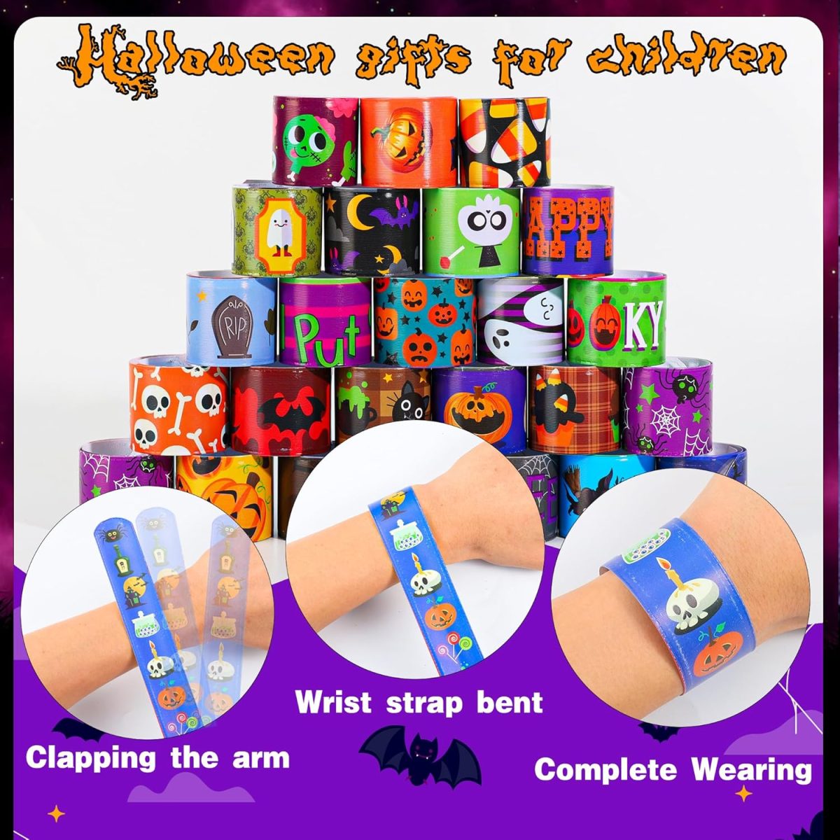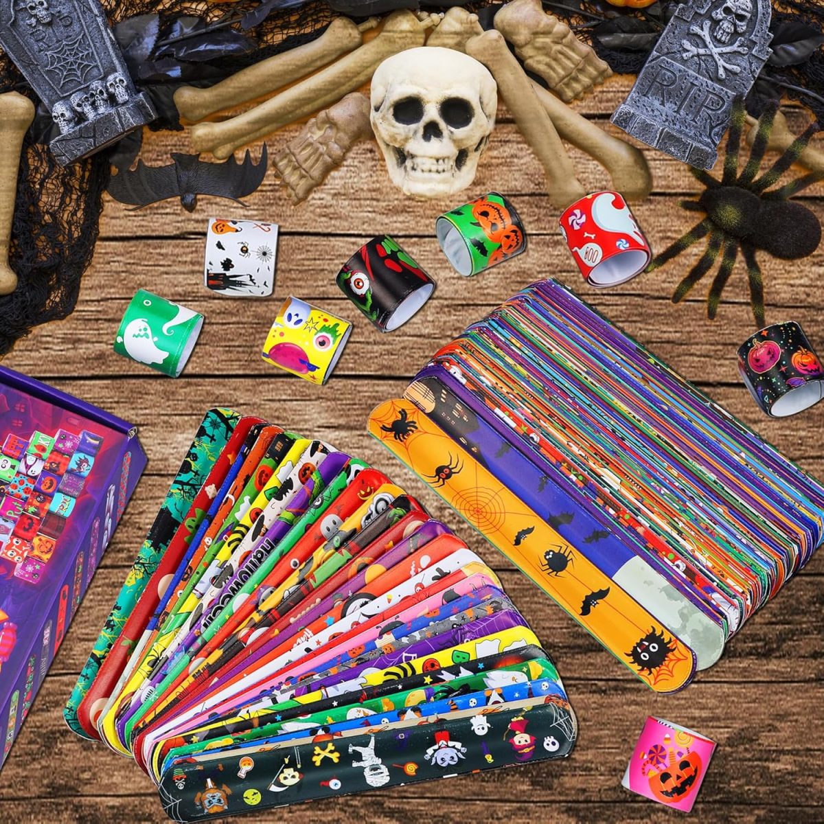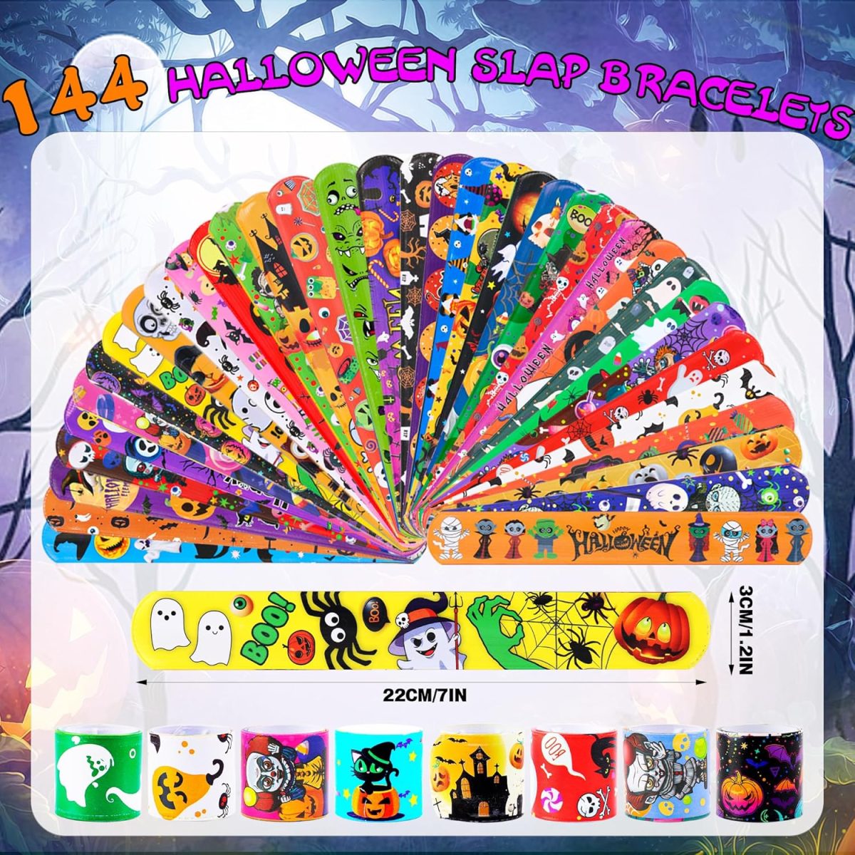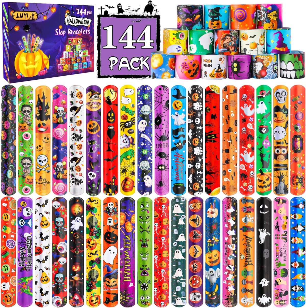 - 144 colorful Halloween slap bracelets with 108 fun designs.
