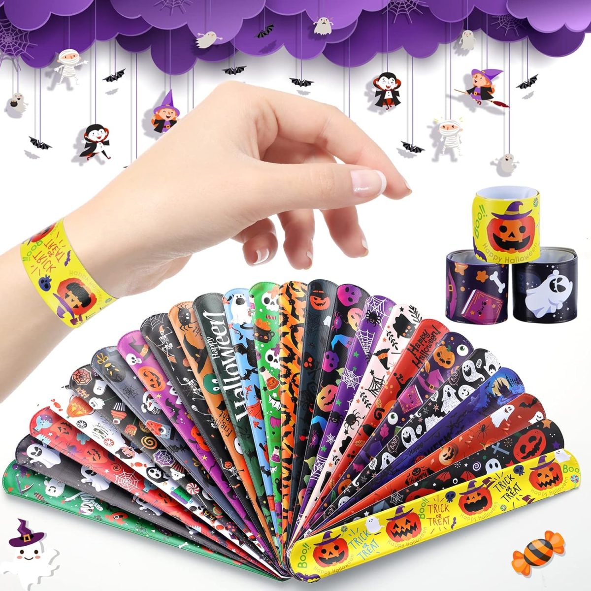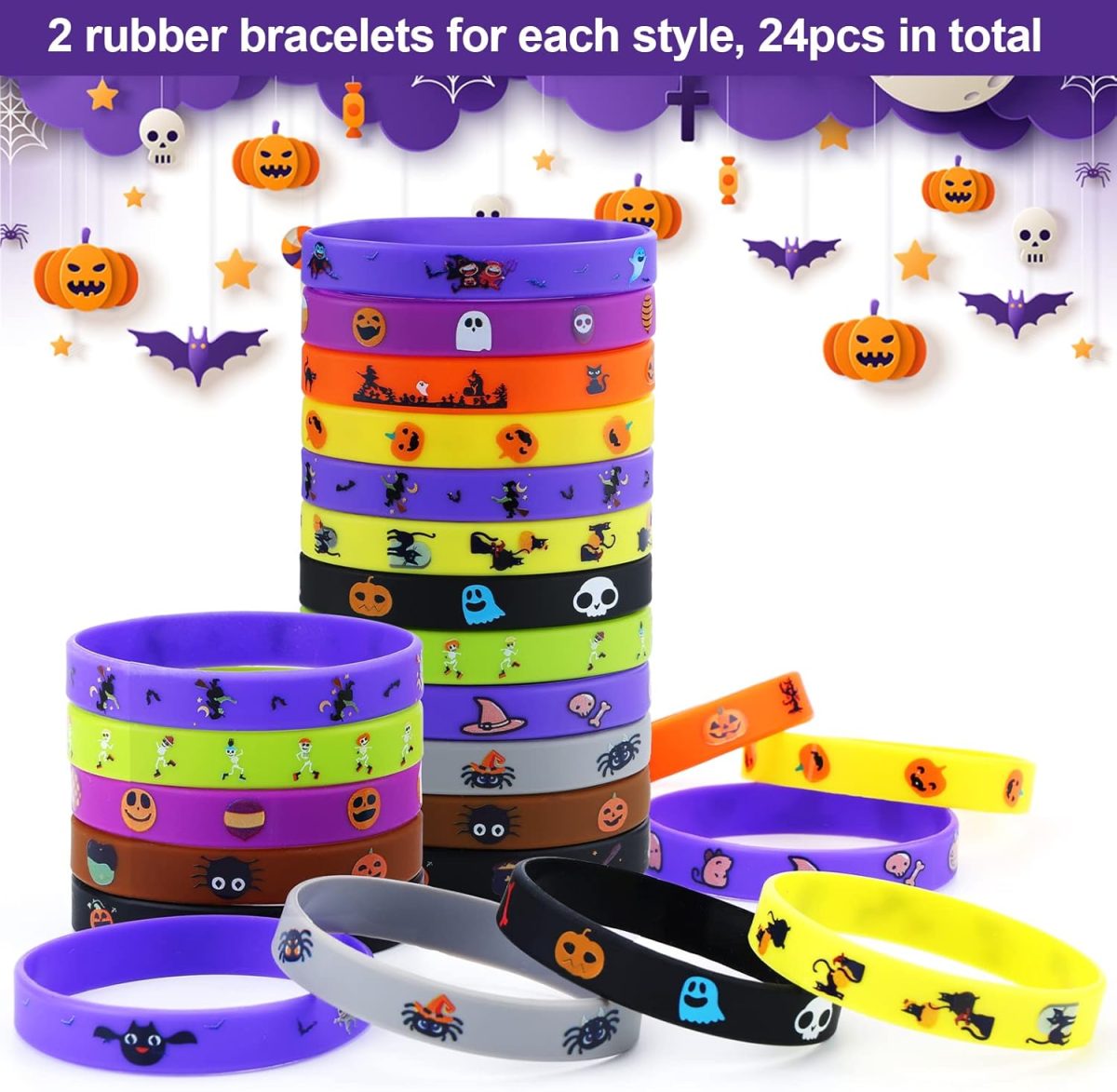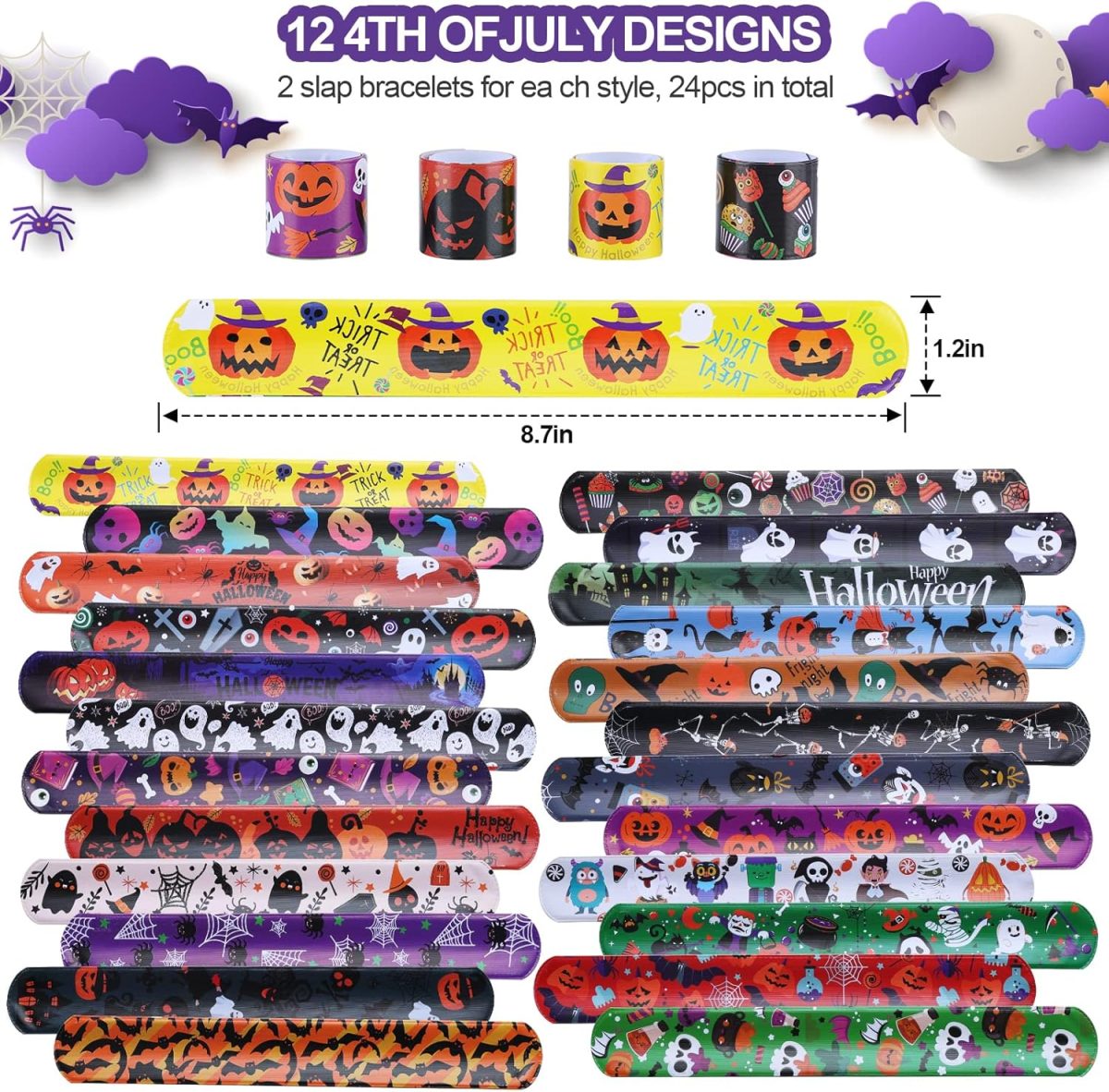 • This set has 24 Halloween slap bracelets and 24 rubber wristbands.